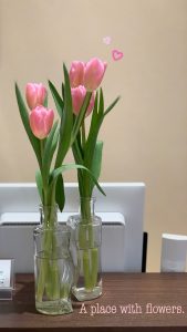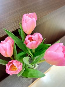 ピンク色のチューリップに見守られて、患者さまにはもちろん